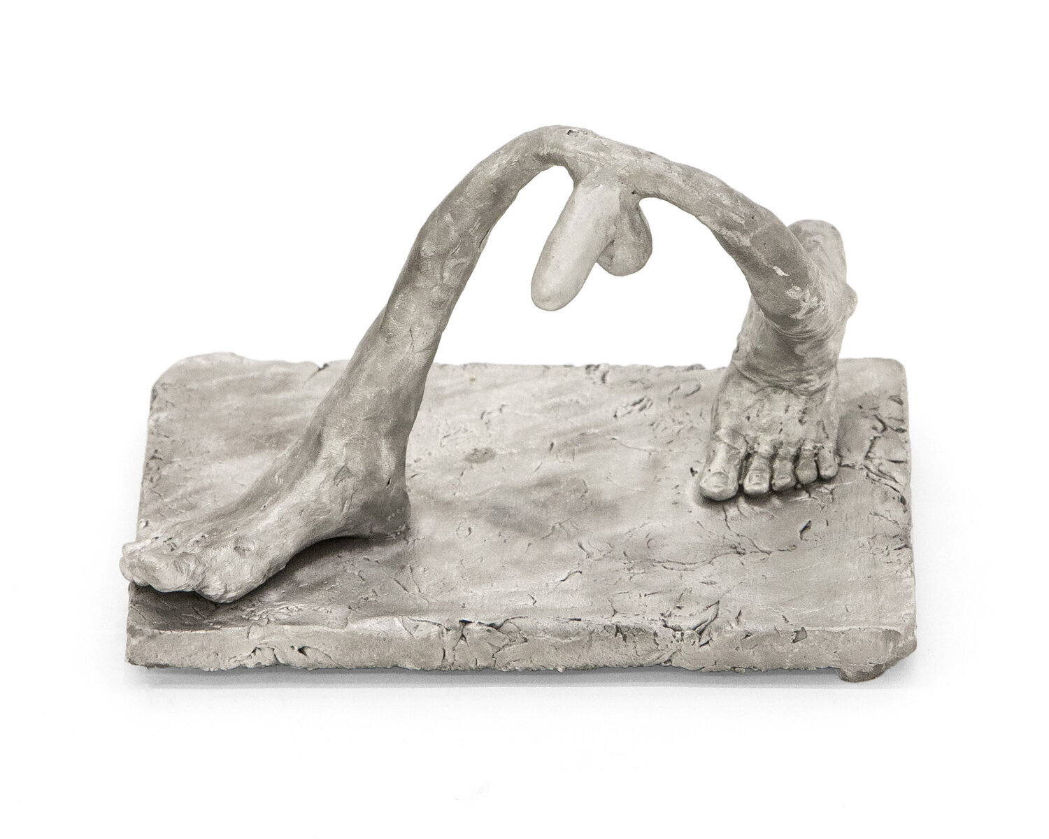 Walking through the array of body parts standing, balancing, crawling, atop pedestals, I am grounded by their materiality and weight, and find myself entering into their recognizable forms: I am the pair of small hands stuck within a steel grid, the green Gumby legs traversing across the x-axis of a chain-link fence, the two aluminum feet, cast mid stroll-- a dangling cock and balls hanging at the meeting of calves -- no other body parts attached.